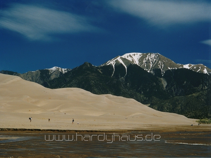 Die Great Sand Dunes waren für mich ein besonderes Erlebnis: Ich bin bei starker Sonnenhitze durch einen eiskalten Bach gewatet, um auf der gegenüberliegenden Seite den heißen Sand der Great Sand Dunes zu erreichen - und im Hintergrund sieht man die zum Teil noch schneebedeckten Berge.