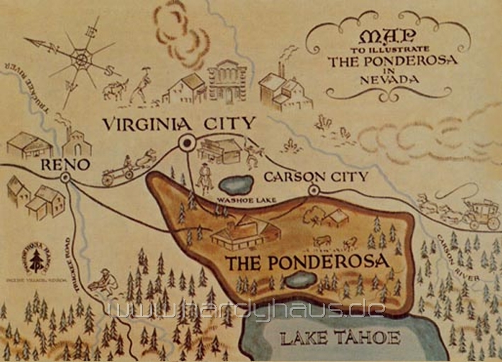 Die Ponderosa-Ranch war der Mittelpunkt der amerikanischen Bonanza-Fernsehserie aus den 60iger Jahren. Die nächsten Orte waren Virginia-City und Carson-City, eine Filmstadt am östlichen Ufer des Lake Tahoe, weitab der echten Orte Virginia City und Carson City. Heute kann die Ranch nicht mehr besichtigt werden, das gesamte Film-Grundstück wurde an einen Privatmann verkauft.